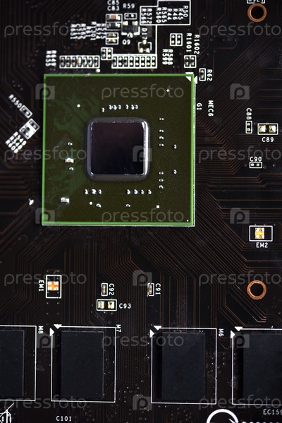 Коричневая печатная плата с микросхемой процессора и планками видеопамяти. Электронные компоненты видеокарты