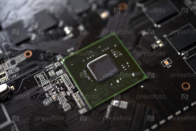 Коричневая печатная плата с микросхемой процессора и планками видеопамяти. Электронные компоненты видеокарты