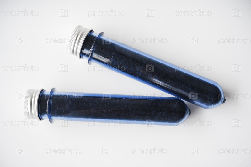 Две синие пластиковые колбы с блестящей крышкой. Колбы с чаем внутри
