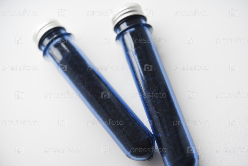 Две синие пластиковые колбы с блестящей крышкой. Колбы с чаем внутри