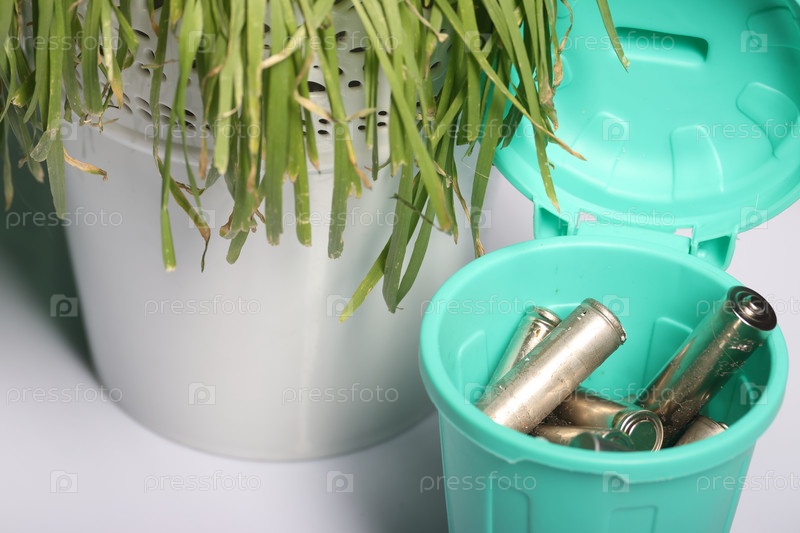 Использованные пальчиковые батарейки в миниатюрном мусорном баке. Рядом вялая трава. Крупный план