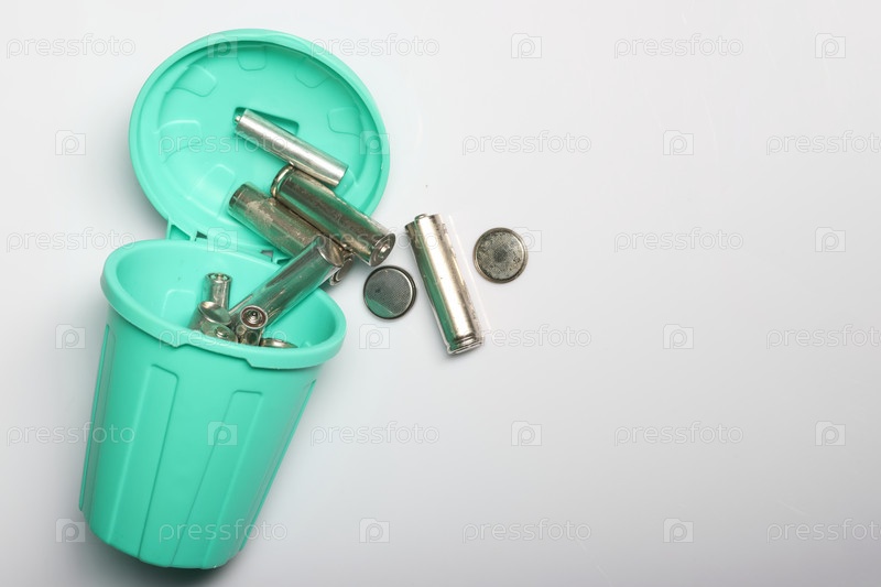 Заставляющая задуматься фотография пальчиковых батареек в мини-контейнере, демонстрирующая необходимость правильных методов утилизации для защиты окружающей среды. на белом фоне