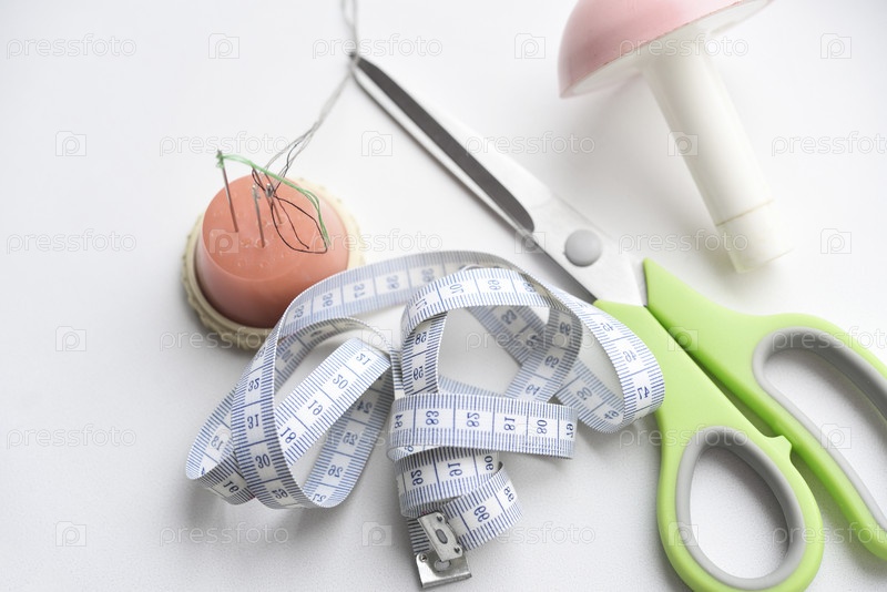 Швейные ножницы, рулетка и нить с иглой. Набор для шитья