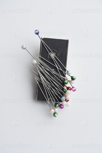 Разноцветные булавки на белом фоне. Булавки и швейный магнит