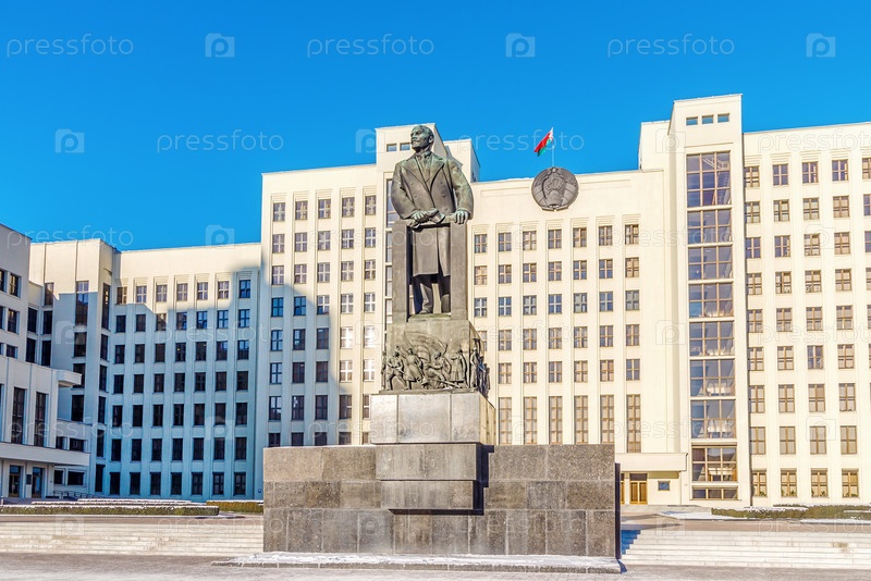 МИНСК, БЕЛАРУСЬ - 7 января 2024 года: Дом правительства Республики Беларусь в Минске на площади Независимости и памятник Ленину перед зданием, улица Советская, 11