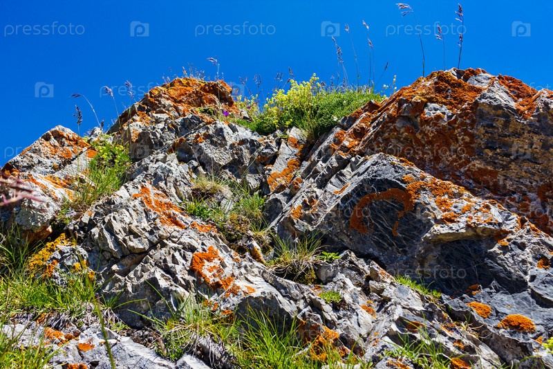 Крупный план камня с оранжевым лишайником и различными растениями