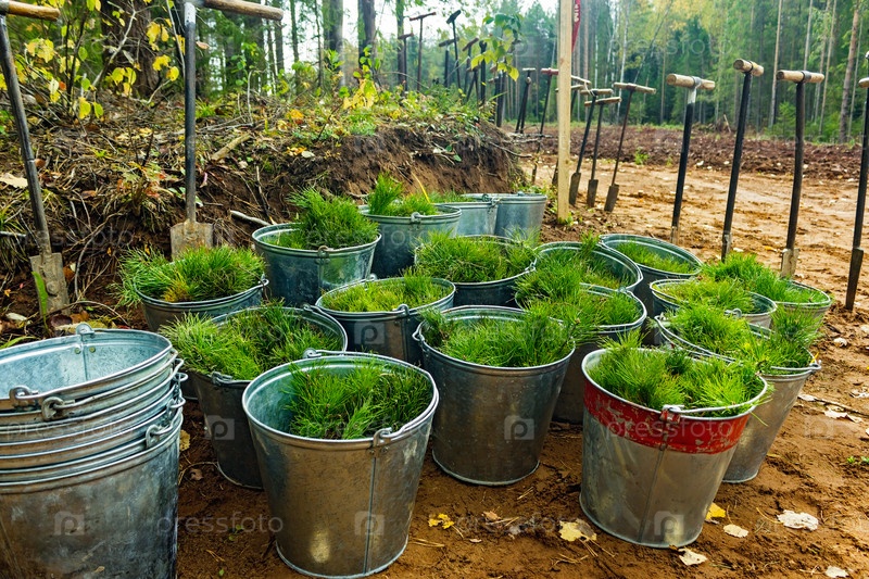 Саженцы сосны в жестяных ведрах, подготовленные к посадке