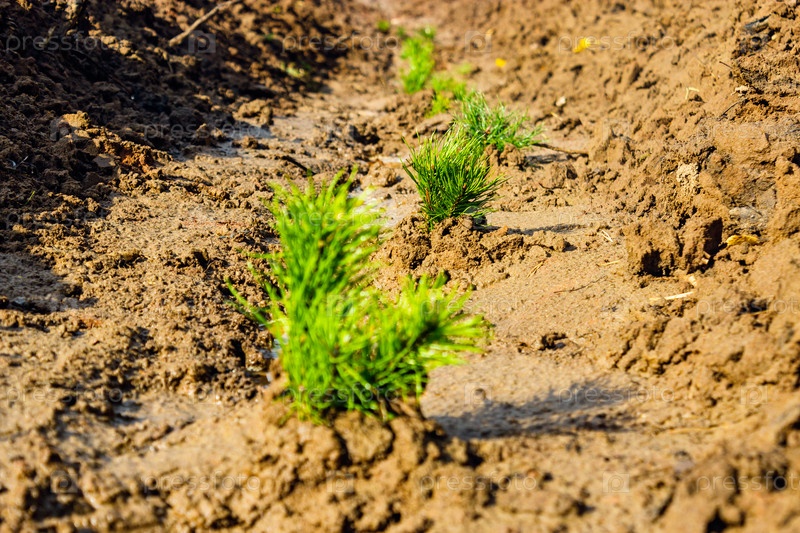 Маленькие саженцы сосны посажены во влажную почву крупным планом