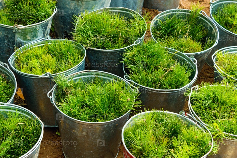 Саженцы сосны в жестяных ведрах, подготовленные к посадке