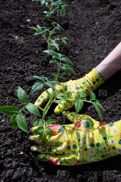 Фермер сажает рассаду помидоров в органическом саду. Высадка молодого растения в грядку