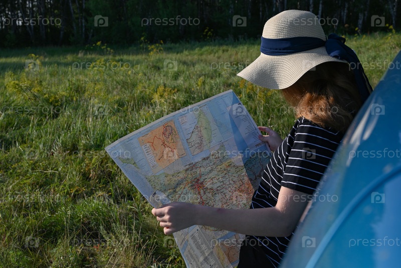 Вид сзади: пара едет по проселочной дороге. Женщина держит карту и показывает карту маршрута своему парню за рулем машины. Пара в путешествии