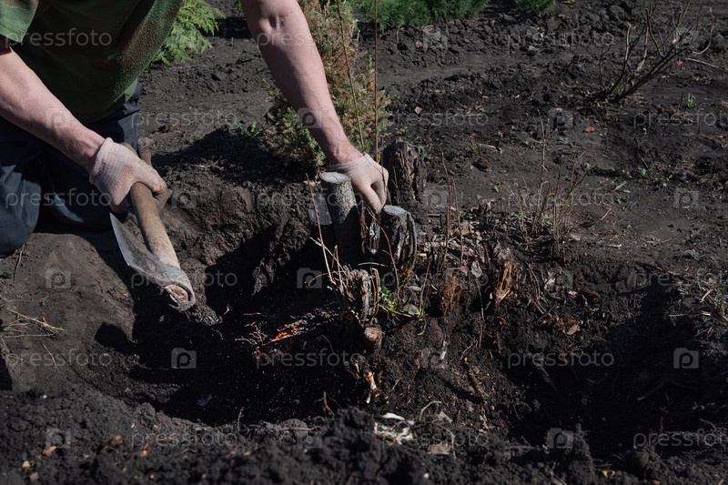 Крупный план садовника весной, пытающегося удалить сухое дерево, выдергивая его корни лопатой