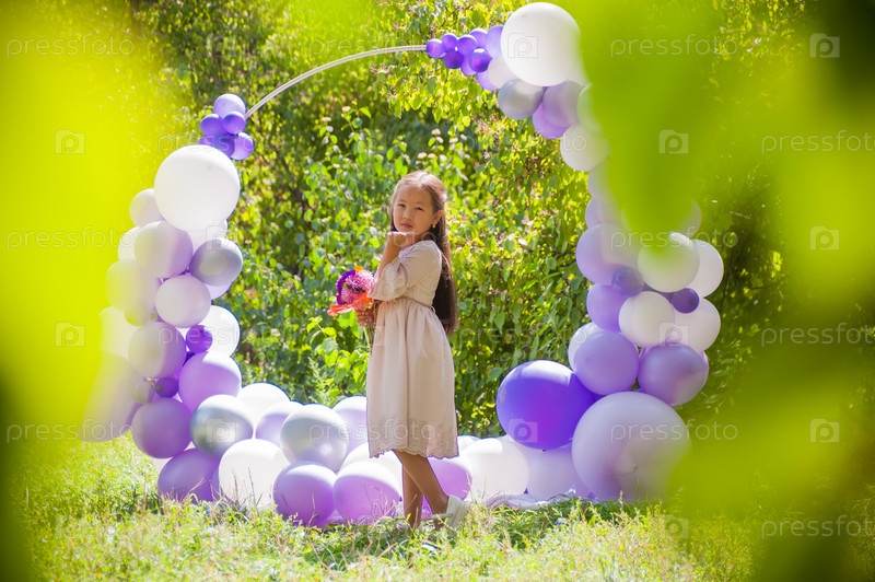 7-летняя азиатка позирует в платье среди зелени на фоне арки из воздушных шаров