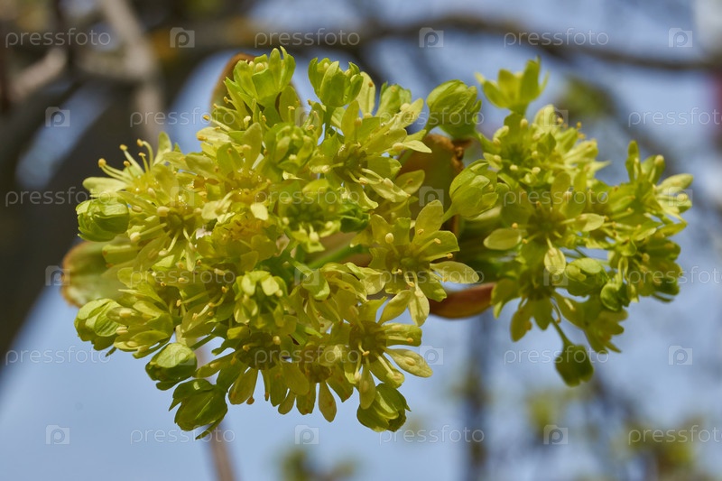 Растворяются цветочные почки остролистного клёна (лат. Acer platanoides). Деревянный вид растения рода Асер семейства Сапиндовых