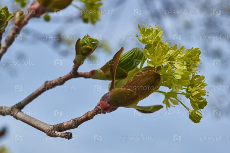 Растворяются цветочные почки остролистного клёна (лат. Acer platanoides). Деревянный вид растения рода Асер семейства Сапиндовых