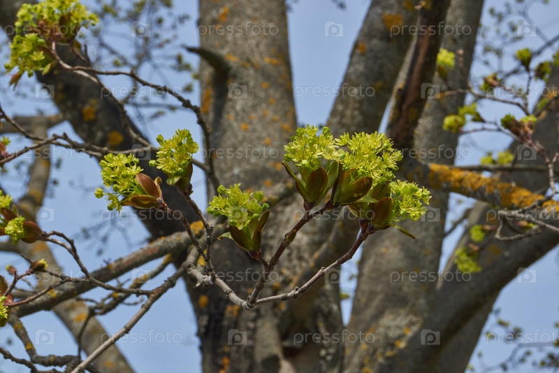 Растворяются цветочные почки остролистного клёна (лат. Acer platanoides). Деревянный вид растения рода Асер семейства Сапиндовых