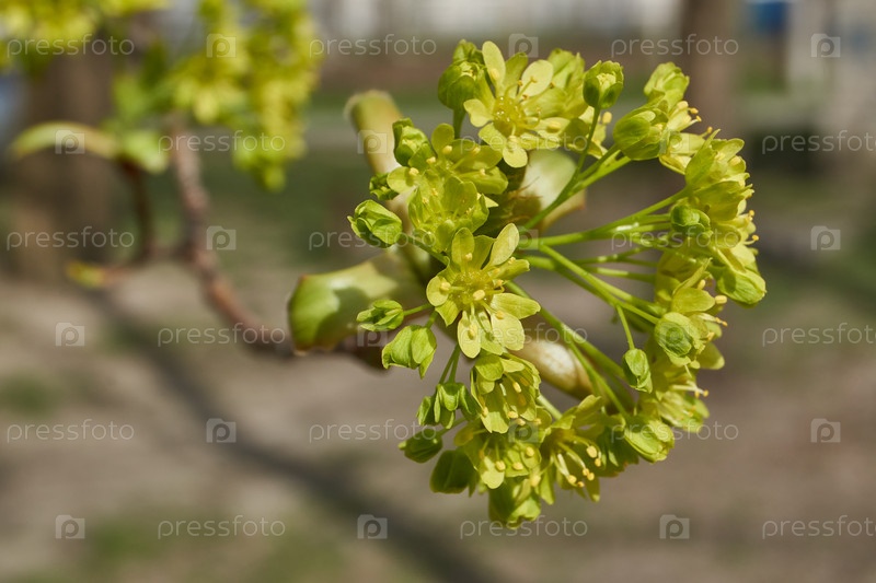 Растворяются цветочные почки остролистного клёна (лат. Acer platanoides). Деревянный вид растения рода Асер семейства Сапиндовых