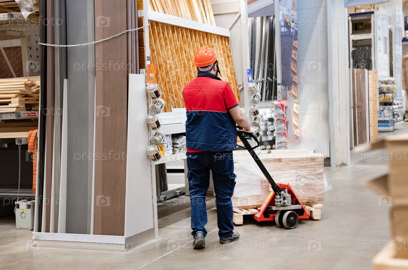 Доставщик с ручной тележкой, загруженной коробками, работает на складе