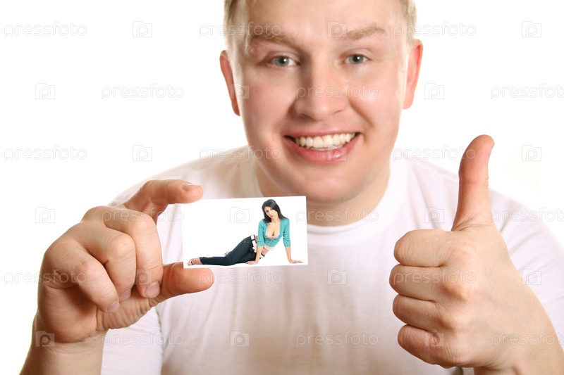 Мужчина с фотографией женщины в руках на белом фоне