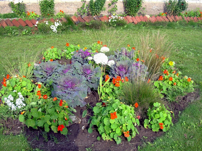 Оформление садового участка, гортензия, настурция, декоративная капуста, злаки