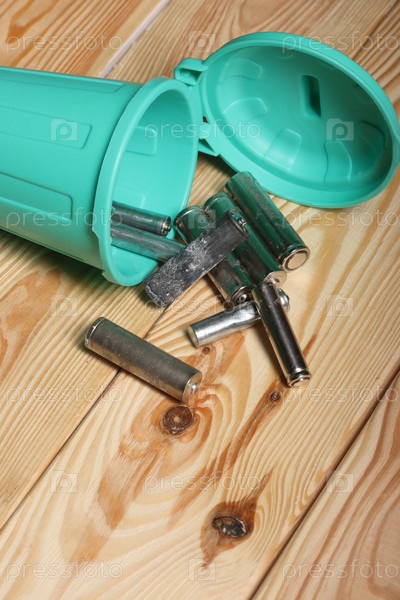 Использованные пальчиковые батарейки в миниатюрном мусорном баке. сосновые доски