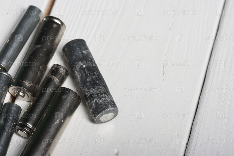 Использованные пальчиковые батарейки на досках. Место для текста. Крупный план