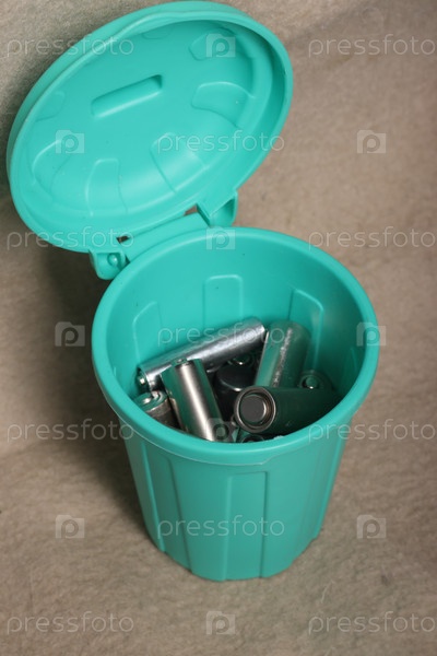 Использованные пальчиковые батарейки в миниатюрном мусорном баке. на бежевом грязном фоне