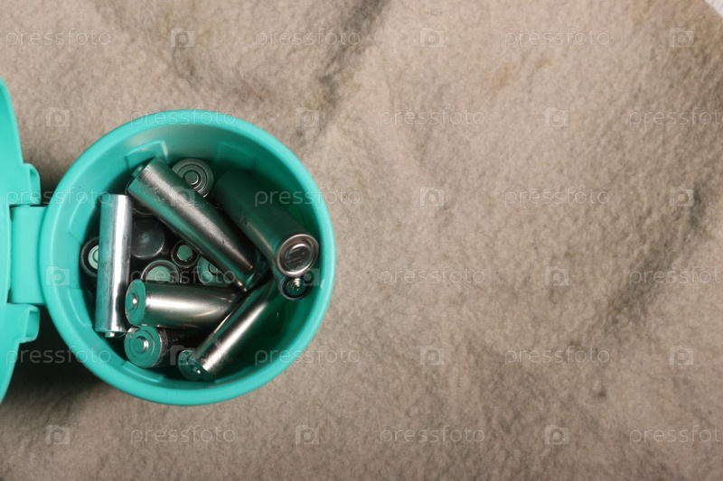 Использованные пальчиковые батарейки в миниатюрном мусорном баке. на бежевом грязном фоне. Переработка отходов