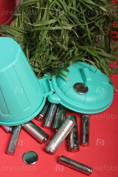 Использованные пальчиковые батарейки в миниатюрном мусорном баке. Увядающая зелень. Розовый фон