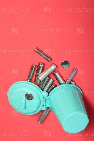 Использованные пальчиковые батарейки в миниатюрном мусорном баке. Розовый фон