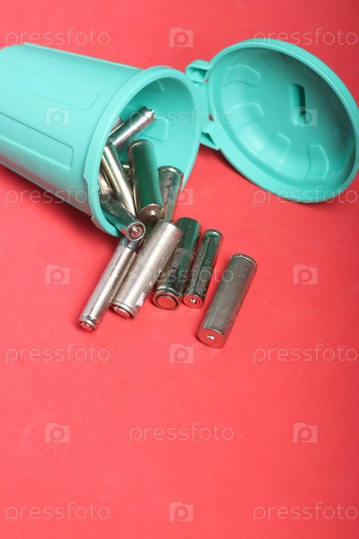 Использованные пальчиковые батарейки в миниатюрном мусорном баке. Розовый фон. Поле для текста