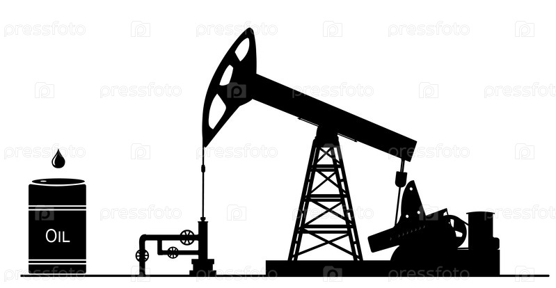 Насосная установка для добычи нефти. Нефть. Черный силуэт насосной нефтяной скважины и бочки на изолированном белом фоне. Энергетическая промышленность. Векторная иллюстрация