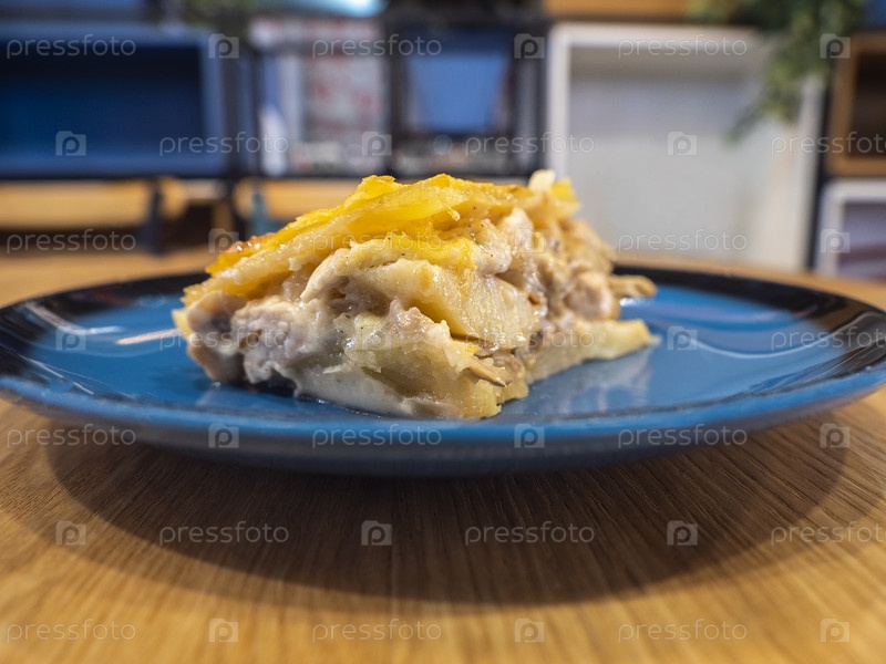 Кусок картофельной запеканки с грибами и курицей, покрытый сырной корочкой на темно-синей тарелке