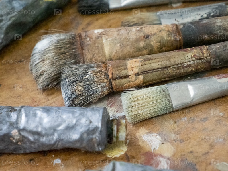 Используемая кисть художника, тюбик и палитра красочной масляной краски на деревянном фоне, для рисования и живописи