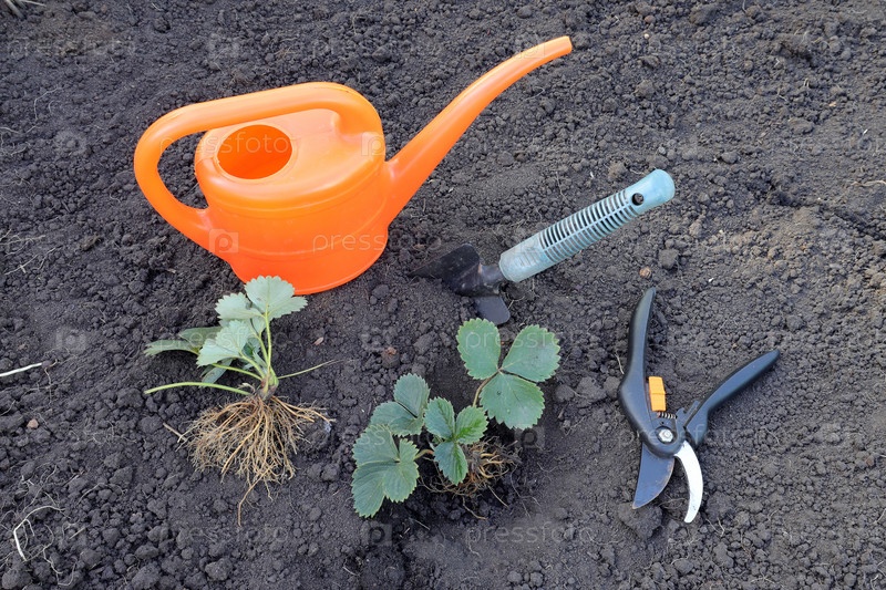 Посадка молодого растения клубники и инструмент для сельскохозяйственных работ