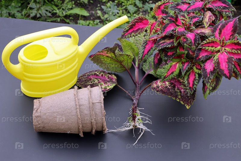 Черенок с корнями декоративного растения колеус, подготовленный к посадке