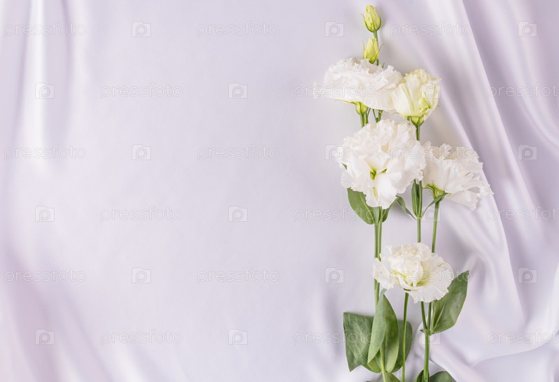 Нежный свадебный фон для дизайна, открытки, приглашения. белые складки атласной ткани и белые живые цветы. Романтический дизайн. Место для копирования