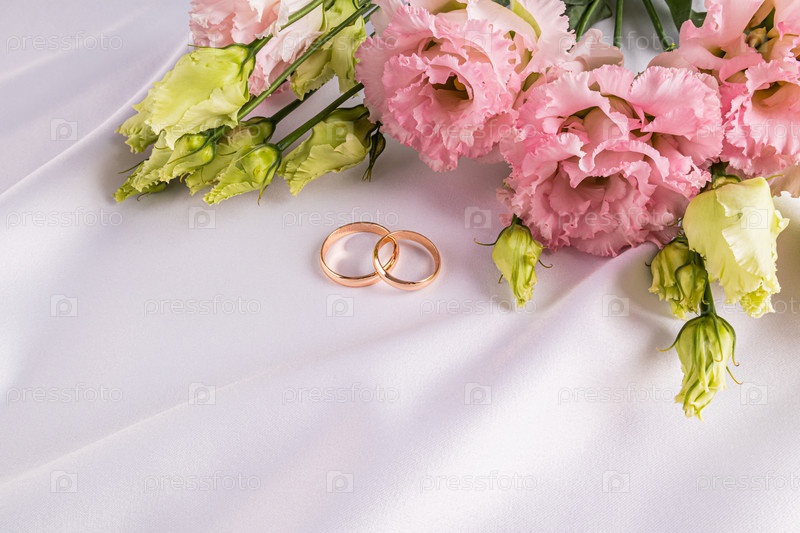 Два золотых классических обручальных кольца на белом атласном фоне со свежими розовыми цветами аустомы. Копировальное пространство. открытка. приглашение. крышка
