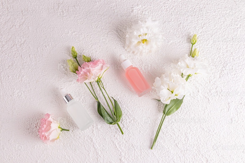 Две матовые косметические флаконы с капельницей с натуральным средством по уходу за кожей лица на белом фоне среди нежных весенних цветов. Плоская планировка