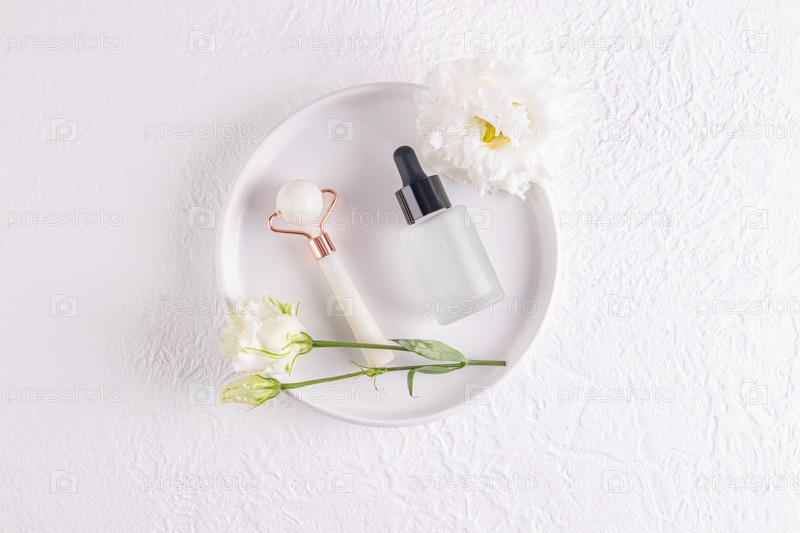 Косметическая матовая бутылка с капельницей с натуральным массажным продуктом, маслом или сывороткой на белой керамической тарелке с цветами и каменным роликовым массажером. спа