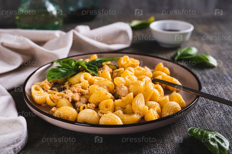Вкусные макароны с фаршем и базиликом на тарелке на столе