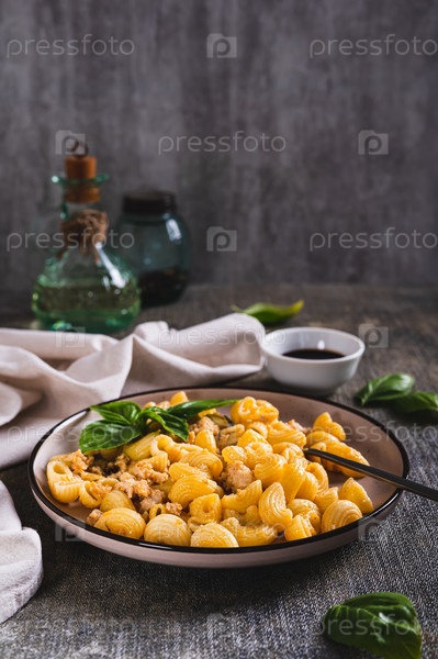 Вкусная паста с фаршем и базиликом на тарелке на столе, вертикальный вид
