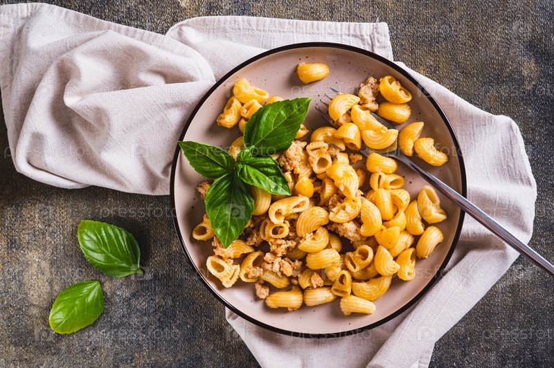 Крупным планом вкусные макароны с фаршем и базиликом на тарелке на столе