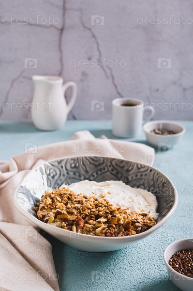 Миска с йогуртом, мюсли и орехами для здорового завтрака на столе, вертикальный вид