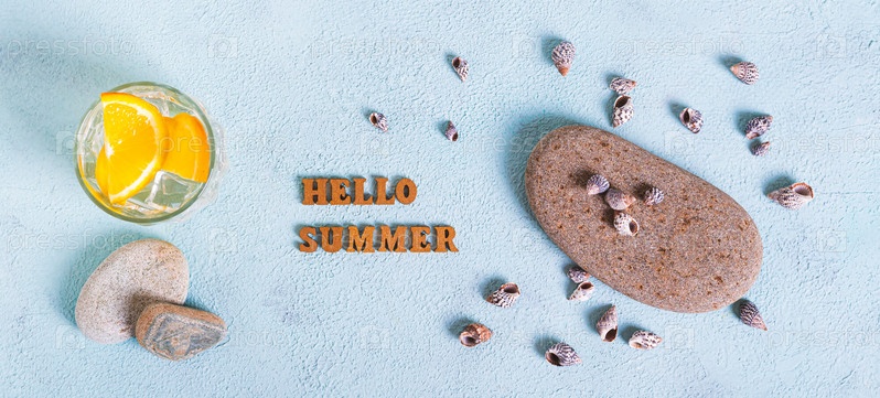 Концепция привет летний текст, коктейль, камни и ракушки на синем веб-баннере сверху