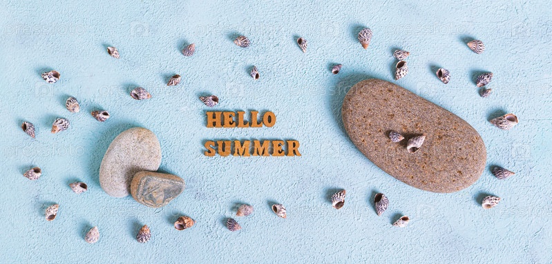 Концепция привет летний текст, камни и ракушки на синем фоне, вид сверху веб-баннера