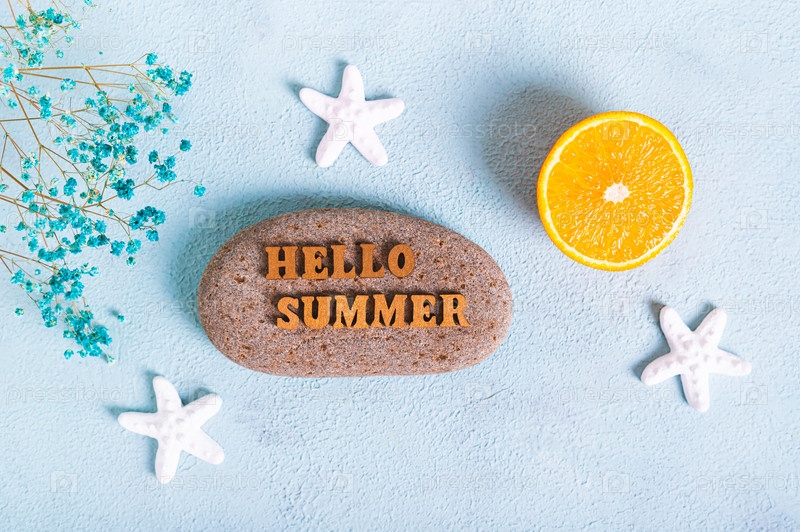Концепция привет летний текст на камне, оранжевом, морских звездах и ракушках на синем фоне, вид сверху