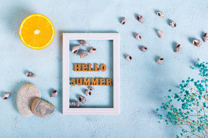 Привет, летний текст в фоторамке, оранжевый, камни, сушеные цветы и ракушки на голубом виде сверху