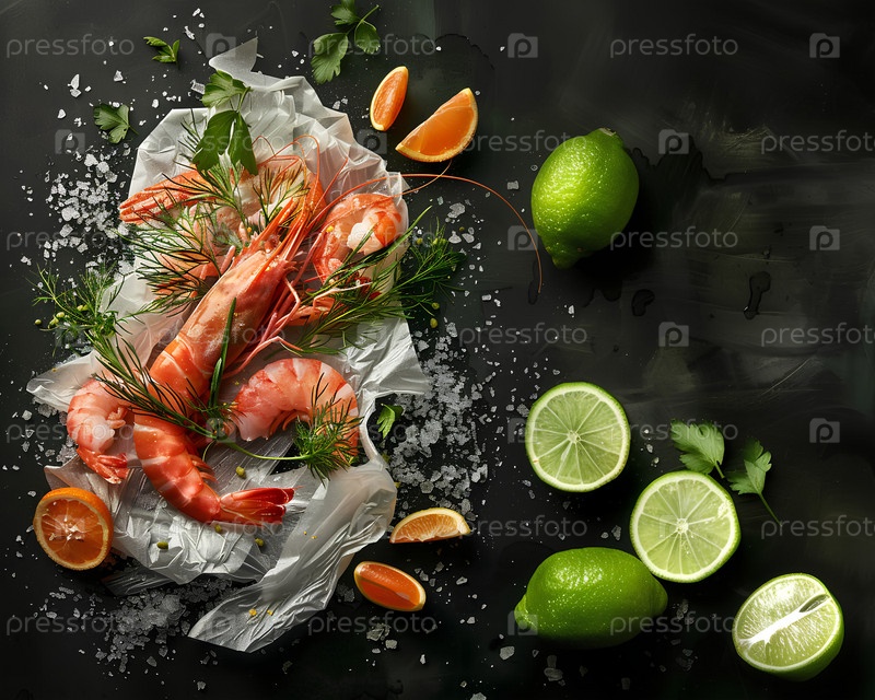 Целые креветки с лимоном, петрушкой и кубиками льда на черном фоне