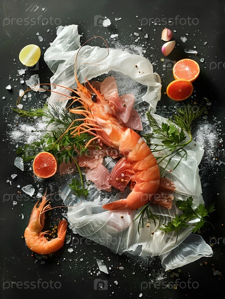 Целые креветки с лимоном, петрушкой и кубиками льда на черном фоне